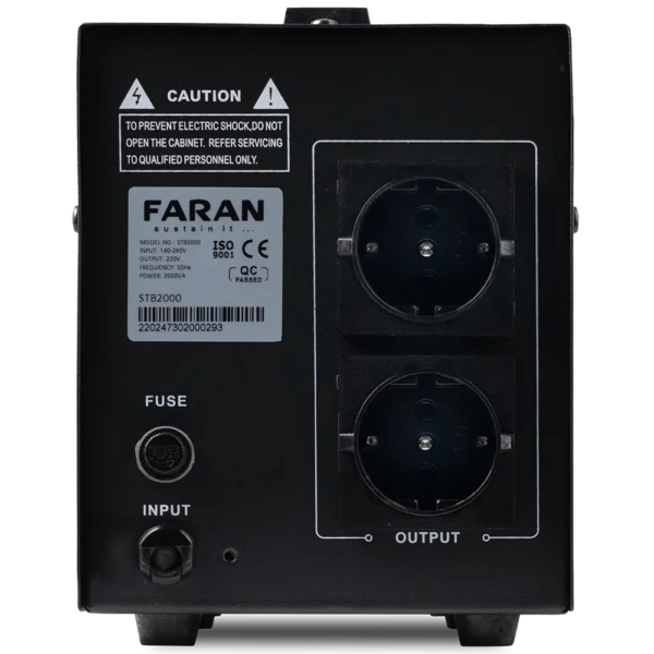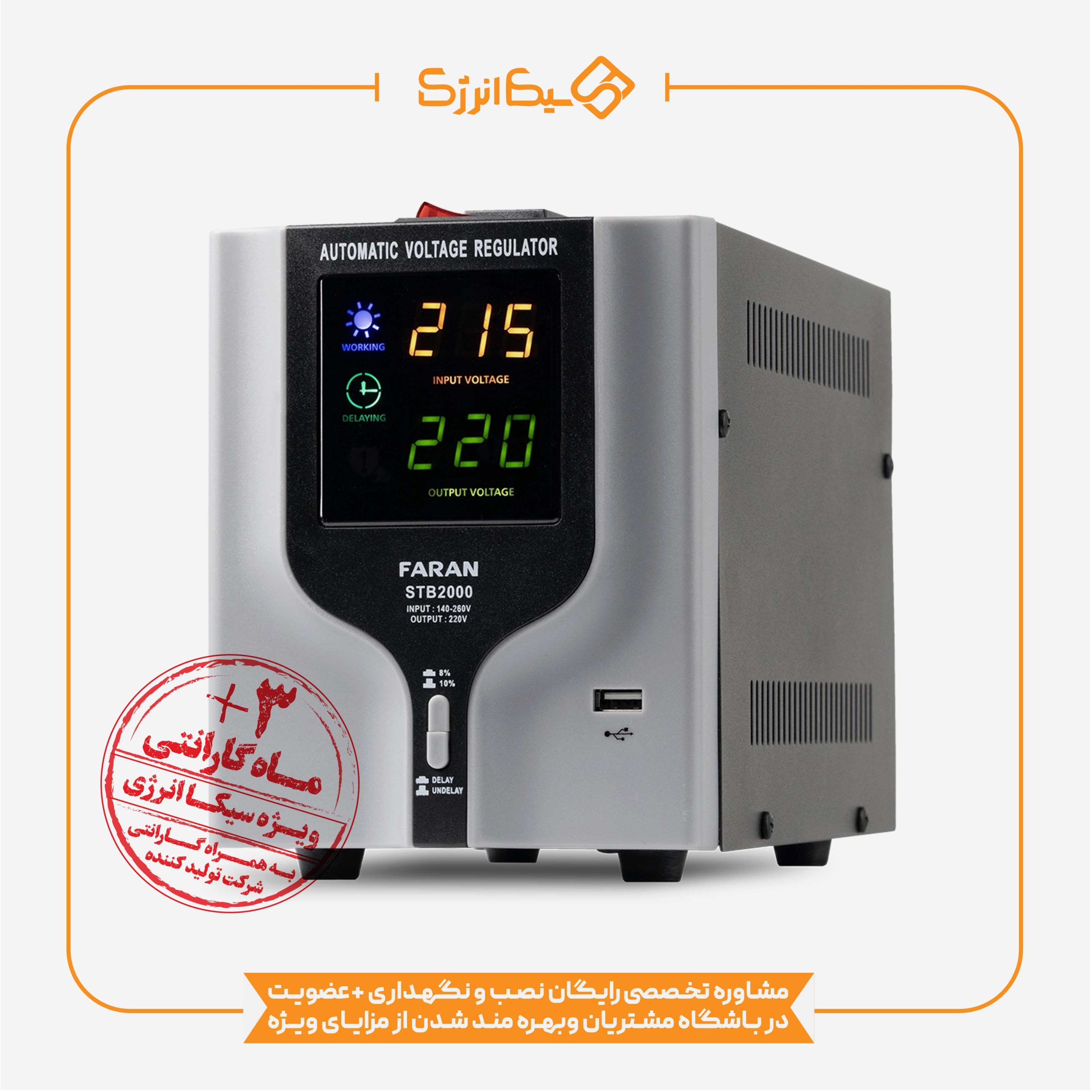 استابلایزرSTB 2000محصولی از شرکت فاران است که نوعی محافظ هوشمند برای لوازم برقی می باشد.این محصول کاربری خانگی و اداری (متناسب با توان استابلایزر) دارد و دارای حفاظت های لازم جهت ایجاد ضریب اطمینان بالا و افزایش طول عمر تجهیزات الکترونیکی می باشد که می تواند برای کامپیوتر و وسایل منزل جهت محافظت در برابر صاعقه و افزایش یاکاهش ناگهانی و دایمی ولتاژ و نویز و نوسانات برق شهر و اتصال کوتاه داخلی وسایل برقی متصل به آن،مورد استفاده قرار گیرد که نتیجه آن کاهش خرابی و تعمیرات این تجهیزات میباشد.همچنین دستگاه در مقابل اضافه بار و افزایش دما، حفاظت شده می باشد. لوازمی از قبیل ماشین لباسشویی،ماشین ظرفشویی،یخچال، تلوزیون و کنسول های گیم،در منازل شرکتها و سازمان ها،ماشین های اداری و تجهیزات آزمایشگاهی،به نوسانات برق بسیار حساس هستند و دچار صدمه می شوند.عملکرد ر به نحوی است که برق مصرفی این تجهیزات تحت شرایطی پایدار قرار گیرد.توان اسمی این استابلایزر برابربا 2000VA با ضریب توان 0.6 است.در نتیجه می تواند توان 1200 وات را ارائه می دهد.بازدهی این محصول تا 98% می باشد و میتواند بازه ولتاژ مناسب 200 الی 239 ولت (این بازه ولتاژ برای دستگاه های الکترونیکی مناسب می باشد) را به صورت پایدار در خروجی خود در اختیار مصرف کننده قرار دهد.برای کنترل پایداری خروجی از پردازنده میکروپروسسوری و کنترل دیجیتال بهره می برد.این محصول با بهره گیری از نمایشگری دیجیتال که ولتاژ ورودی و خروجی را به صورت لحظه ای به کاربر نمایشمی دهد،کارکرد کابر با دستگاه را تسهیل می کند.ورودی استابلایزر 2000VA به وسیله فیوز حفاظت شده است.نمایشگر ولتاژ خروجی استابلایزر، ولتاژ نامی دستگاه را نمایش می دهد وهمه استابلایزرهای رله ای دارای 10% تلرانس طبیعی در خروجی می باشند وتغییرات ولتاژ برق شهر بیش از 10% ولتاژ نامی (220 ولت) نیاز به تثبیت شدن دارد.